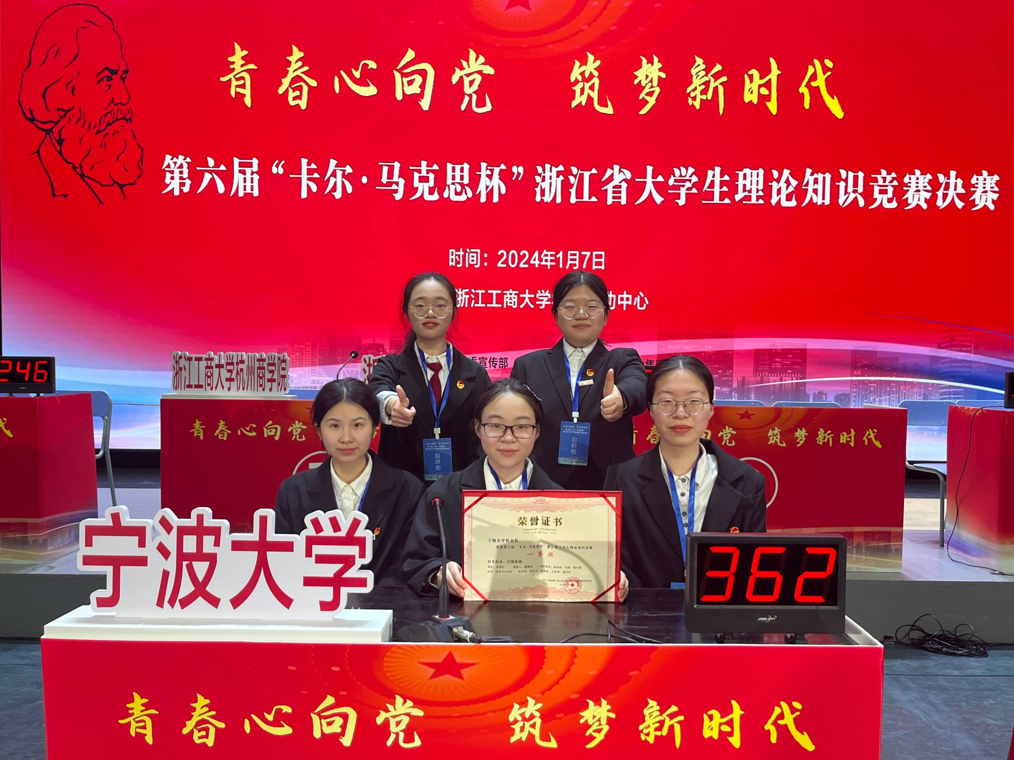 2024年1月7日,参赛一行人赴浙工商参加省赛决赛。决赛分共答题、抢答题、风险题、时政评论四个环节进行。比赛现场,团队分工合作、沉着应对,在风险题、时政评论环节均取得全场最高分,最终以367分的成绩获得一等奖。同城约炮