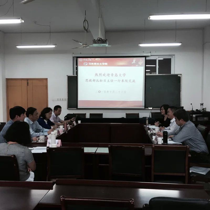 10月26日上午,青岛大学思政部主任丛松日一行3人来同城约炮 交流座谈,同城约炮 院长陈正良、副院长李小兰、院长助理于成文和李包庚参与了交流座谈。座谈中,双方主要就人才培养和思政课教学改革等问题进行了交流研讨。