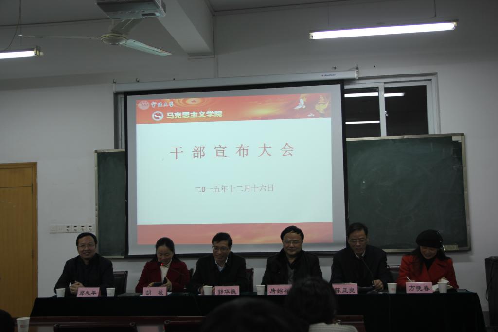 12月16日,学院召开干部宣布大会,校党委书记郭华巍、党委副书记唐绍祥、校党委委员、组织部部长胡敏来院宣布干部任免工作,学院陈正良院长主持会议。学院党政领导班子,中层干部和教职工等30多人参加了会议。