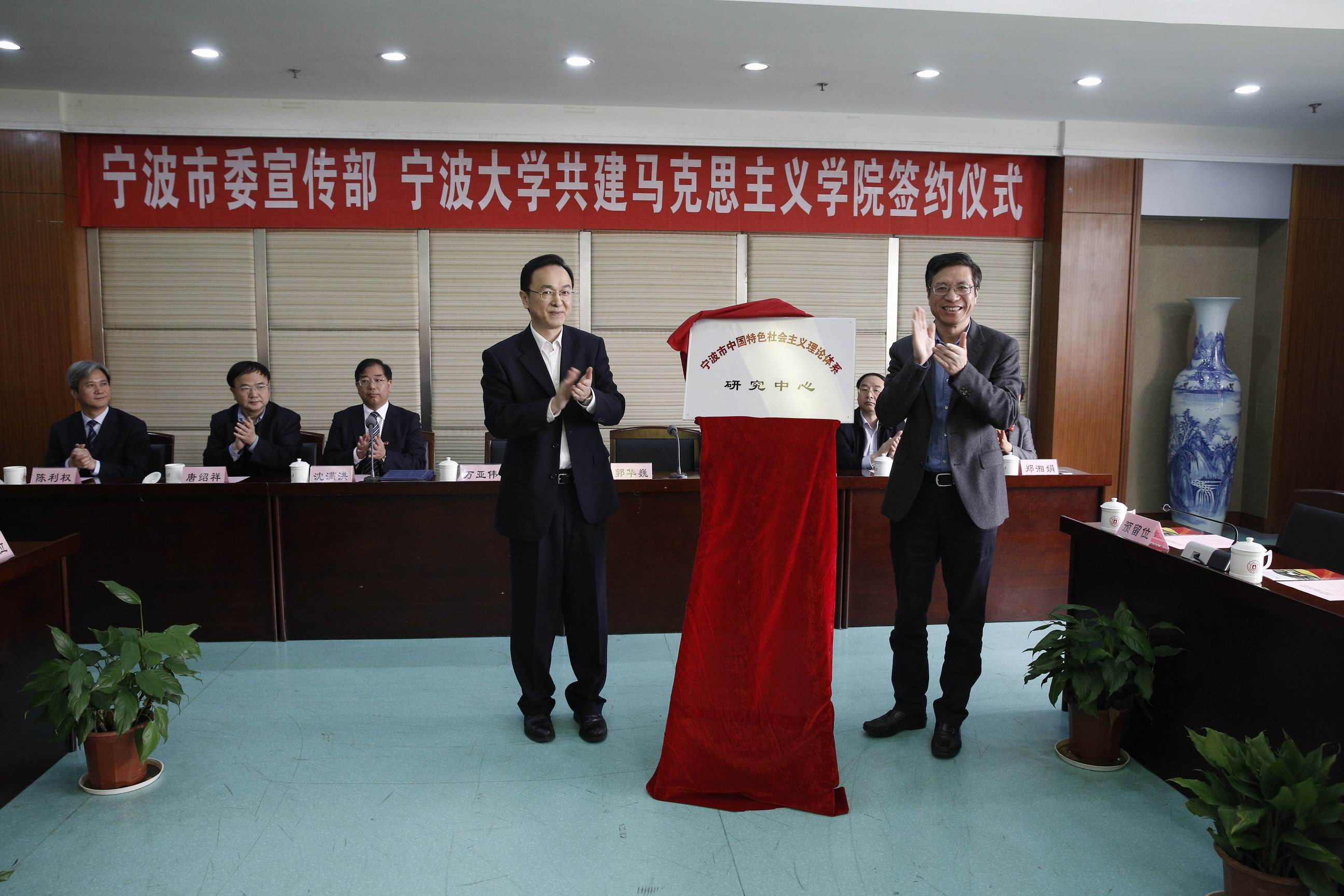 万亚伟和郭华巍共同为“宁波市中国特色社会主义理论体系研究中心”揭牌