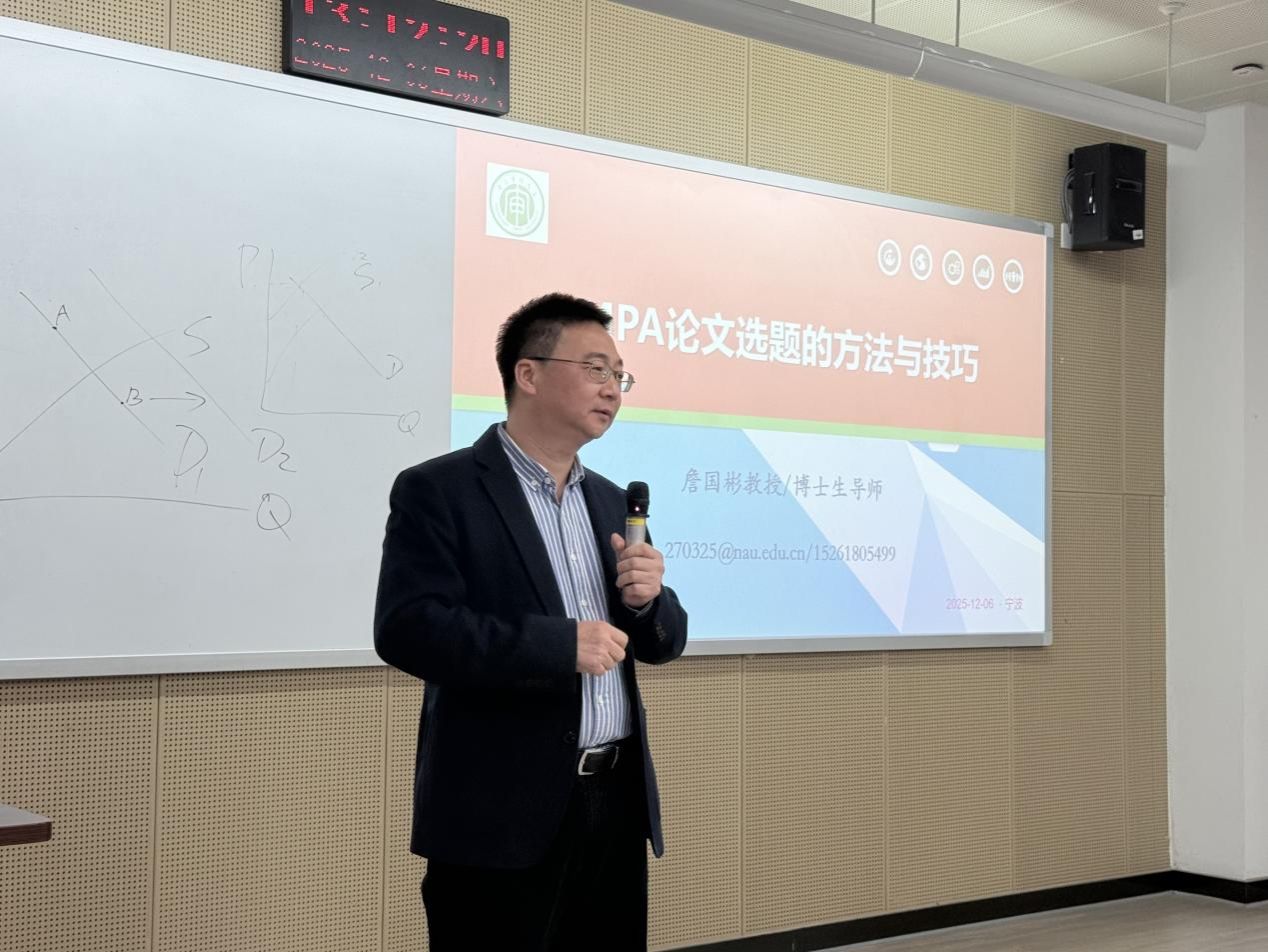 2025 年 12 月 6 日,我主办的 “MPA 论文选题专题讲座” 在2号楼101教室圆满举行。本次讲座以 “MPA 论文选题的方法与技巧” 为主题,特邀南京审计大学公共管理学院博士生导师詹国彬教授担任主讲嘉宾,为在场 MPA 学子及相关专业师生带来了一场兼具理论深度与实践指导性的学术分享,有效破解了论文选题中的常见困惑。