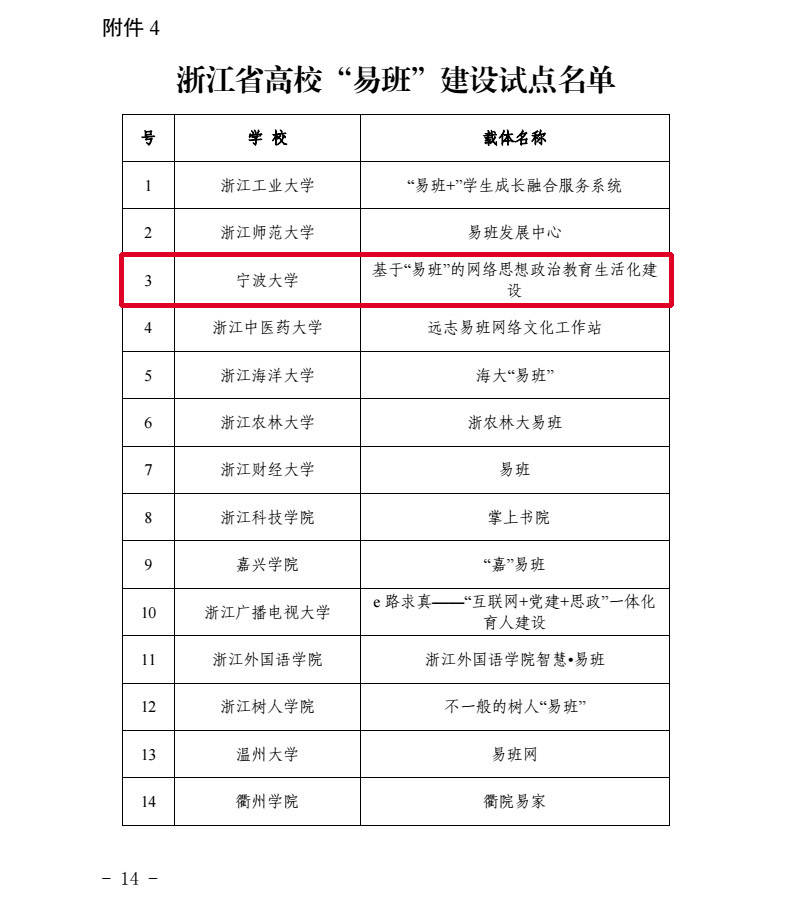 根据《浙江省高校思想政治工作质量提升工程建设标准和管理办法》(浙教工委〔2018〕29号),浙江省教育厅组织开展了此次全省高校思想政治工作质量提升工程实施载体的申报和遴选工作,分别为文化育人示范载体、实践育人示范载体、名师工作室、“易班”建设试点。