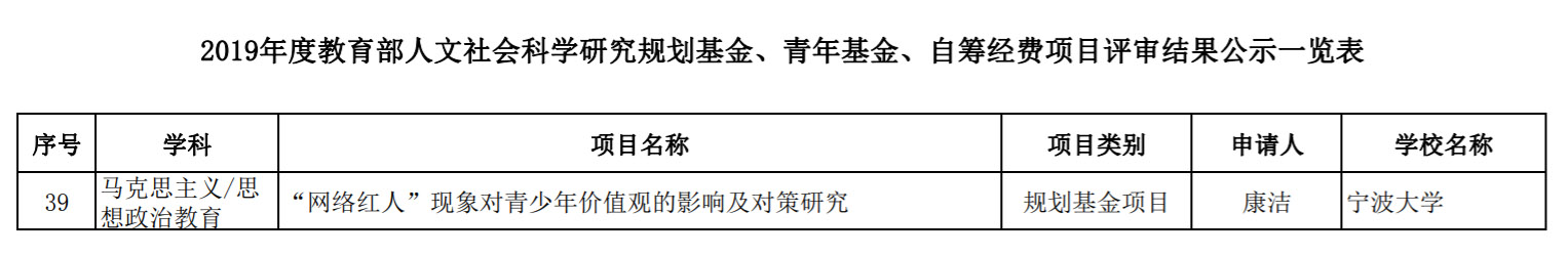 1月29日,教育部社科司对2019年度教育部人文社会科学研究一般项目评审结果进行公示。其中,规划基金、青年基金、自筹经费项目共3098项通过专家评审。同城约炮 康洁老师的项目《“网络红人”现象对青少年价值观的影响及对策研究》获规划基金项目立项公示。