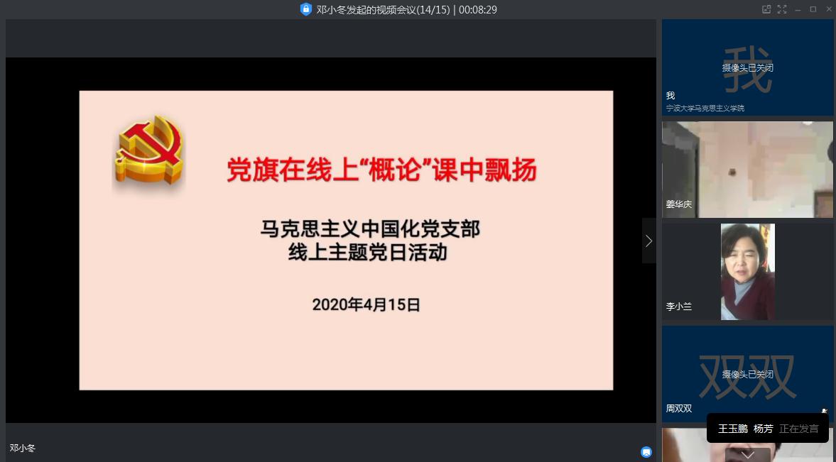 4月15日下午,马克思主义中国化党支部组织开展“党旗在线上‘概论’课中飘扬”线上主题党日活动。此次活动由支部书记袁玲儿主持,“概论”课程组共计11人参加。