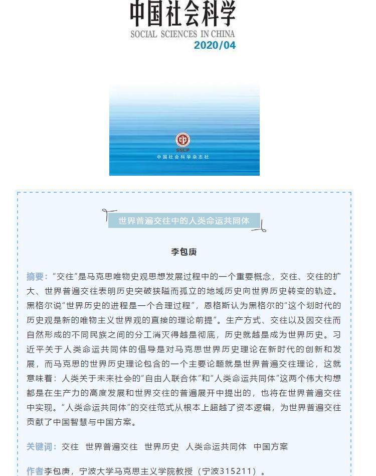 近日,我校李包庚教授在人文社科权威期刊《中国社会科学》(2020年第4期)发表学术论文《世界普遍交往中的人类命运共同体》,这是我校马克思主义理论学科在《中国社会科学》上发表的首篇权威论文。