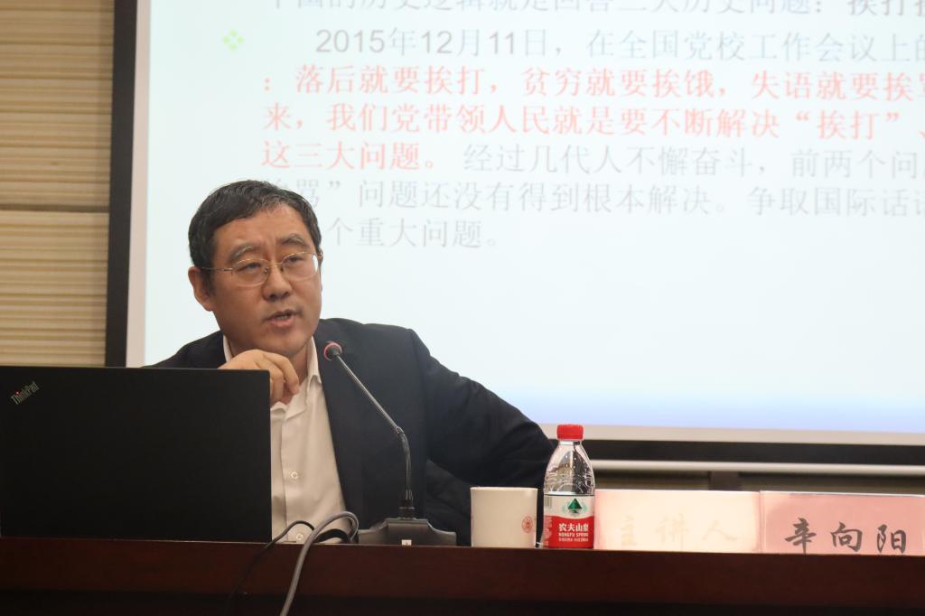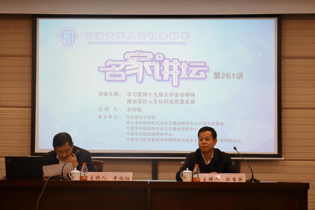 人文社科“名家讲坛”第261讲在安中大楼碧华厅开讲。中国社科院马克思主义研究院党委书记辛向阳教授为宁大师生做了题为“学习贯彻十九届五中全会精神推动高校人文社科高质量发展”的学术报告。校人文社科处处长张宝歌主持报告会。