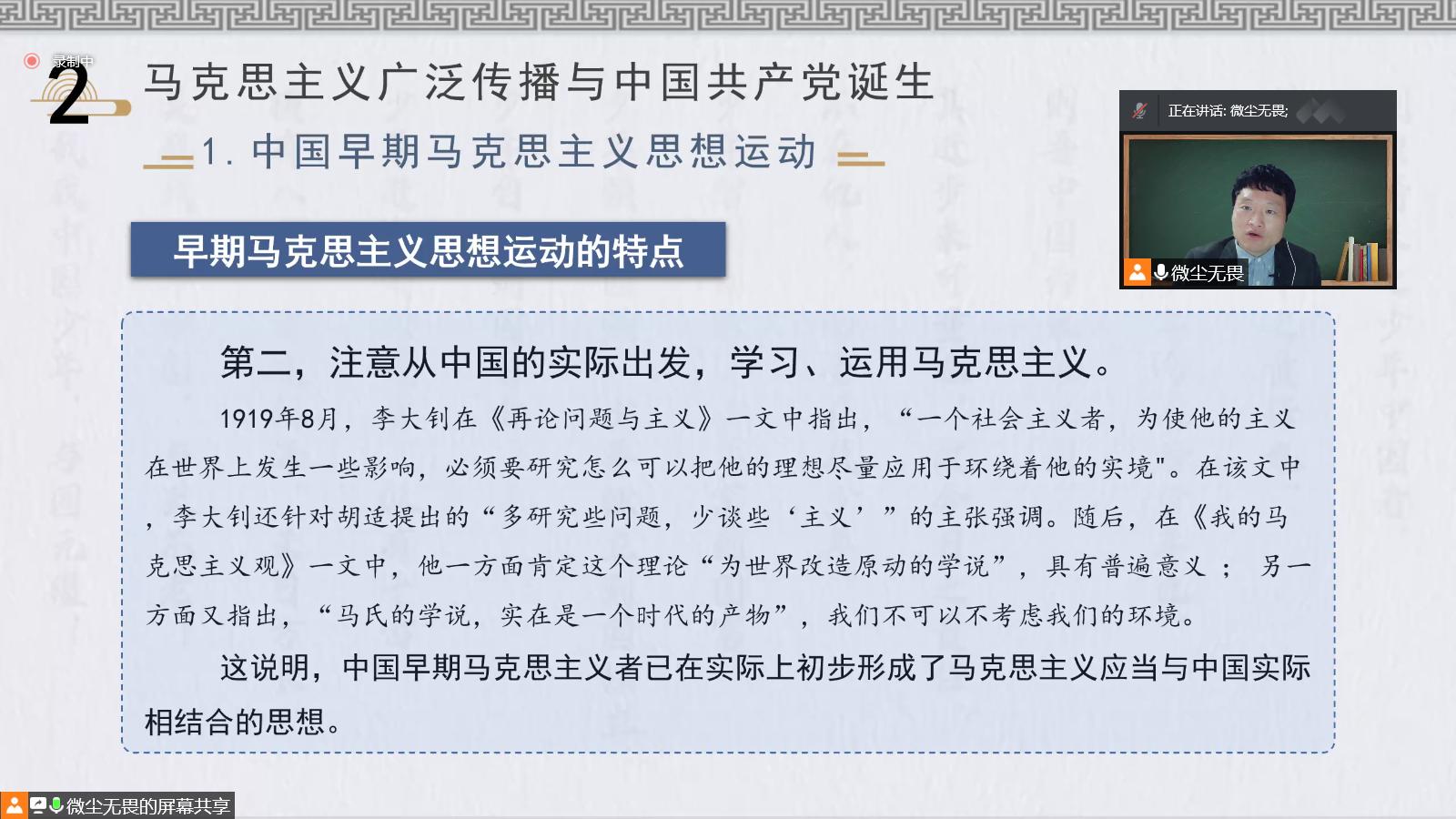 陈兴亮博士主讲课程为《中国近现代史纲要》的“马克思主义广泛传播与中国共产党诞生”一节。陈博士以习近平总书记在纪念五四运动100周年大会上的讲话为切入口,详细讲解了以下三方面内容:中国早期马克思主义思想运动、马克思主义与中国工人运动的结合、中国共产党的成立及其意义。课堂上,陈博士就早期马克思主义者如何把马克思主义同中国的具体实际相结合进行了深入的剖析。陈博士教学语言流畅,讲解思路清晰,教学内容深入浅出,善于引发学生的思考,树立正确的历史观。