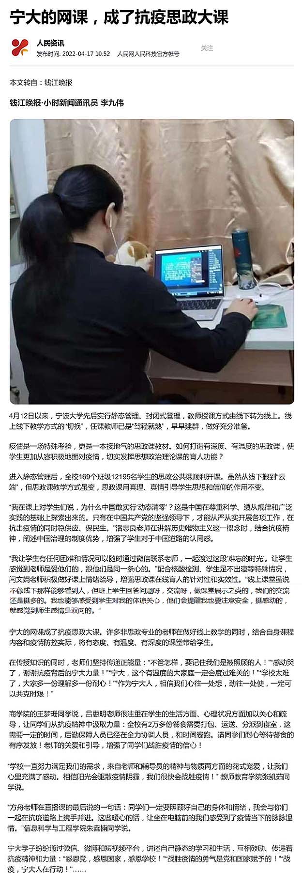 如何打造有深度、有温度的思政课,使学生能够更加从容积极地面对疫情?同城约炮 如何切实发挥思想政治理论课的育人功能?4月17日的钱江晚报对同城约炮 抗疫思政云课堂作了报道……