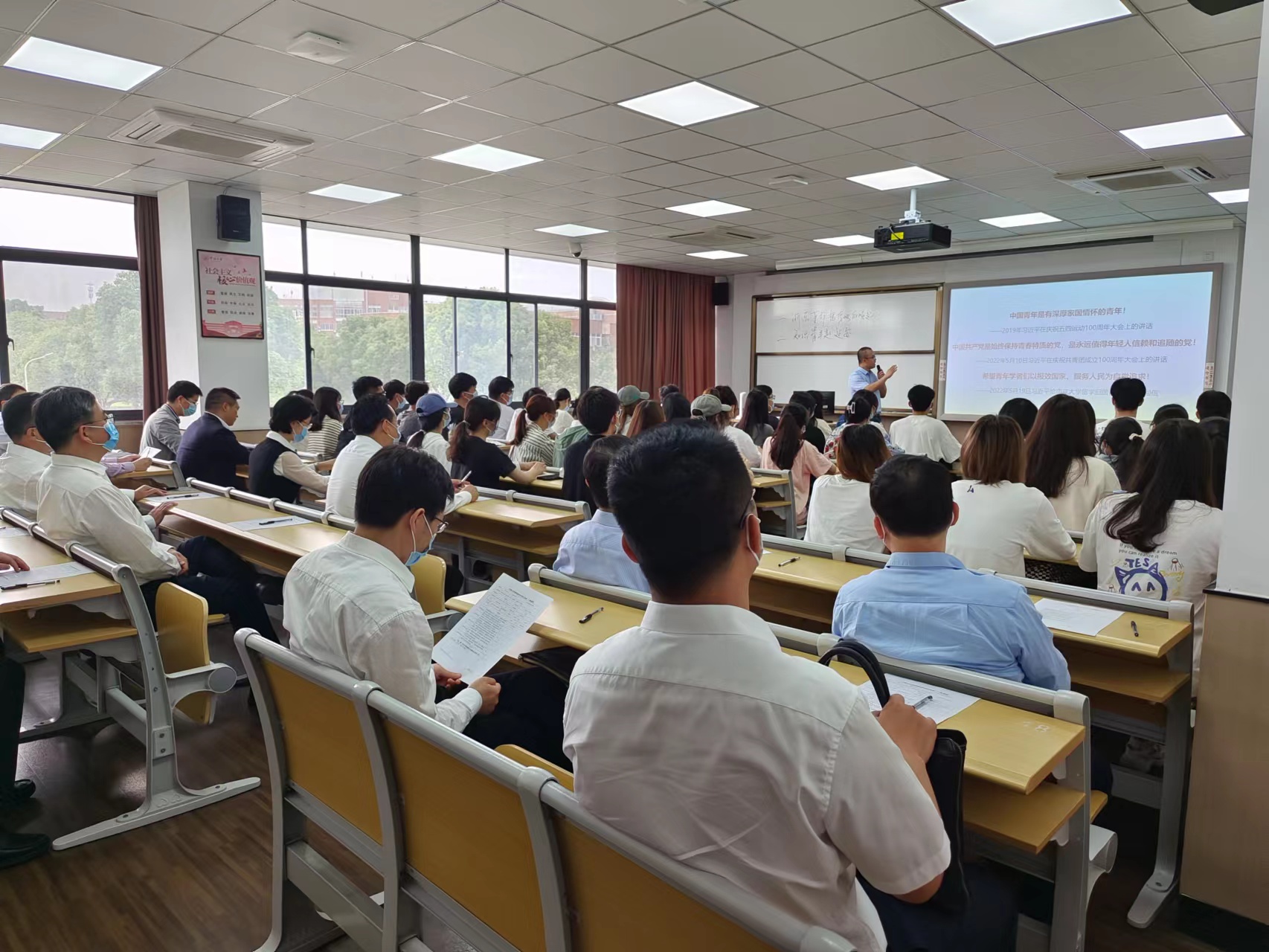 郑善庆副教授正为学生讲授《中国近现代史纲要》课程,课堂上他以习近平总书记在庆祝中国共青团成立100周年大会上的讲话为导入,围绕“抗日根据地何以发展壮大”的主题,以浙东革命根据地的崛起为例,用逻辑严密的讲述、深入浅出的说理,不时结合丰富详实的历史资料和循循善诱的引导,让同学们对伟大延安精神有了深刻体悟。