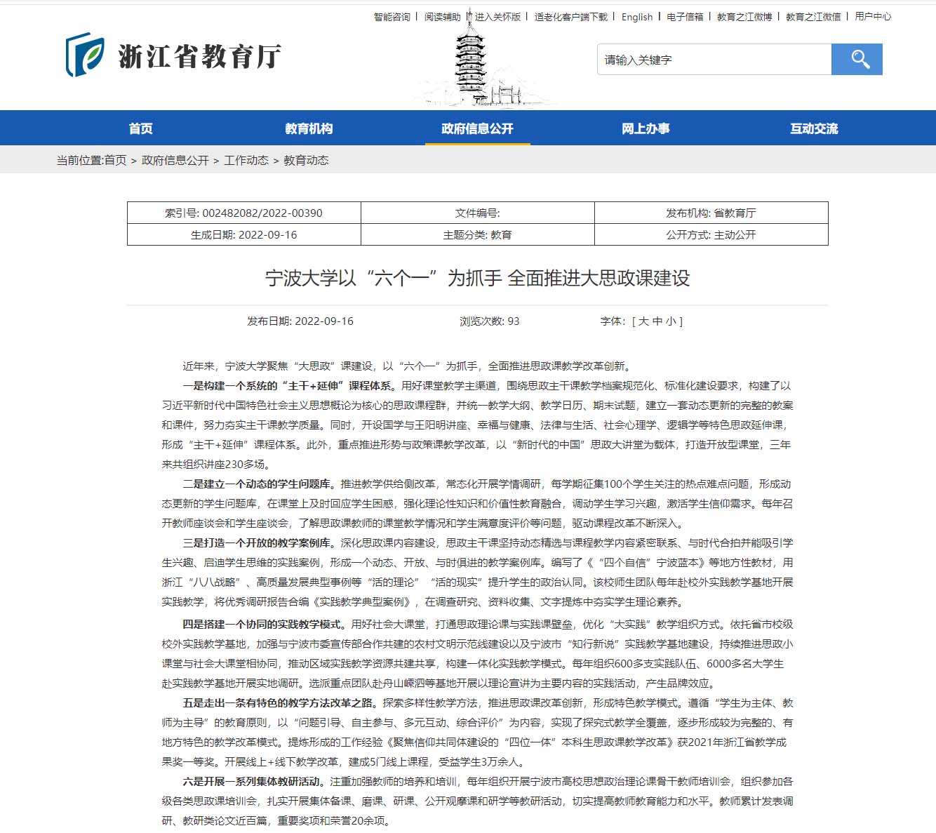 五是走出一条有特色的教学方法改革之路。探索多样性教学方法,推进思政课改革创新,形成特色教学模式。遵循“学生为主体、教师为主导”的教育原则,以“问题引导、自主参与、多元互动、综合评价”为内容,实现了探究式教学全覆盖,逐步形成较为完整的、有地方特色的教学改革模式。提炼形成的工作经验《聚焦信仰共同体建设的“四位一体”本科生思政课教学改革》获2021年浙江省教学成果奖一等奖。开展线上+线下教学改革,建成5门线上课程,受益学生3万余人。