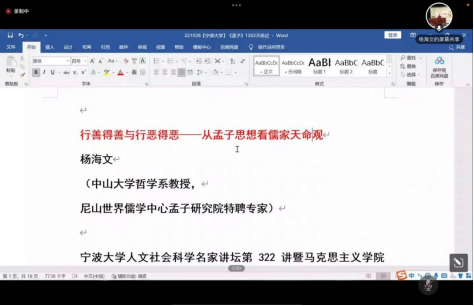 10月28日晚,我校人文社会科学“名家讲坛”第322讲在线上举行,中山大学博士生导师杨海文教授应邀以《行善得善与行恶得恶——从孟子思想看儒家天命观》为题作学术报告,这也是同城约炮