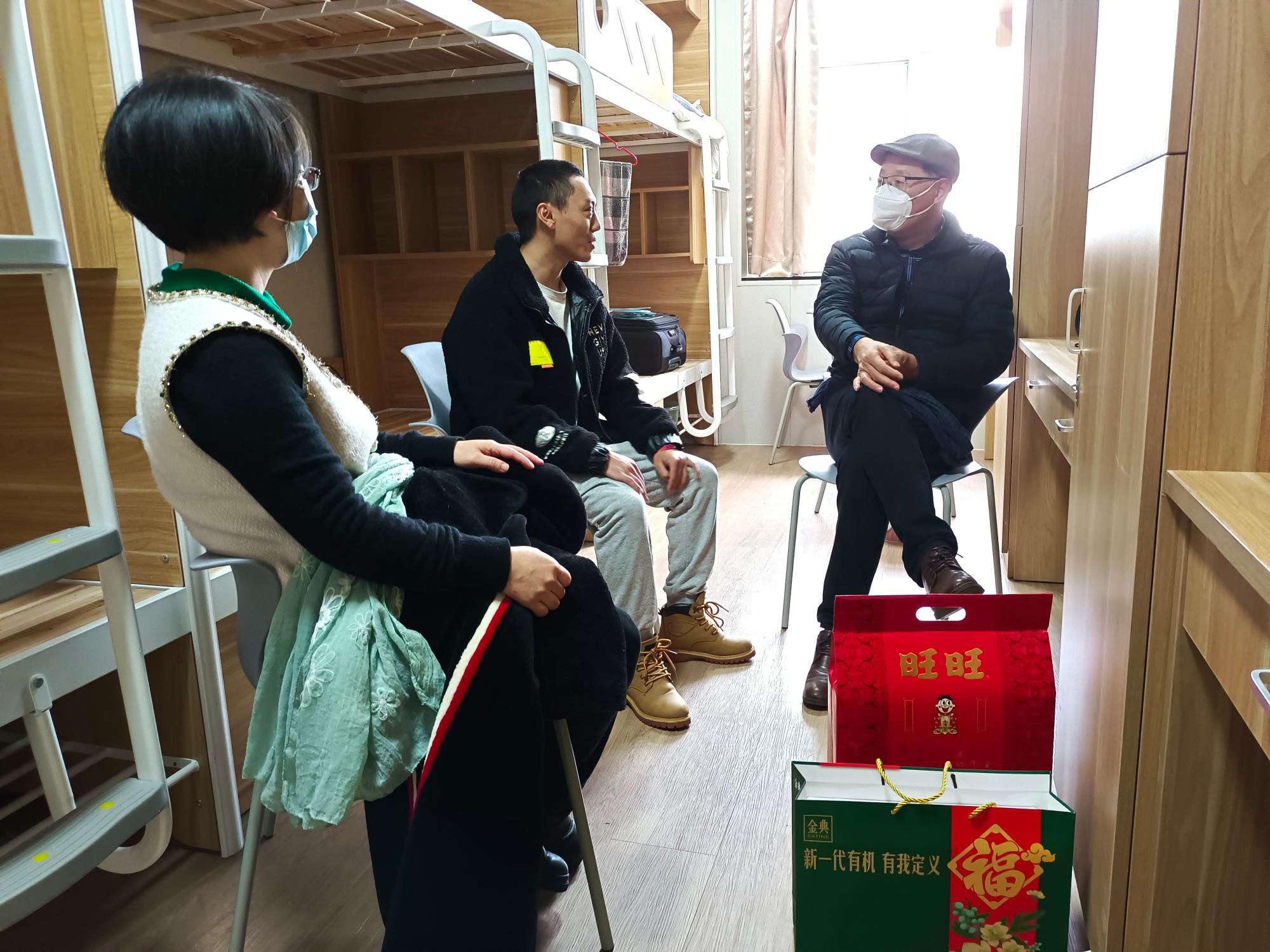 党委书记蒋开东、党委副书记吴莲红、辅导员杨曼一行走访春节留甬师生,并为师生送上牛奶、坚果、旺旺大礼包等在内的“新春礼包”,代表学院向师生们致以春节问候。