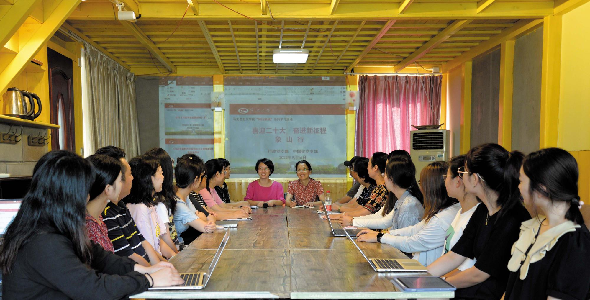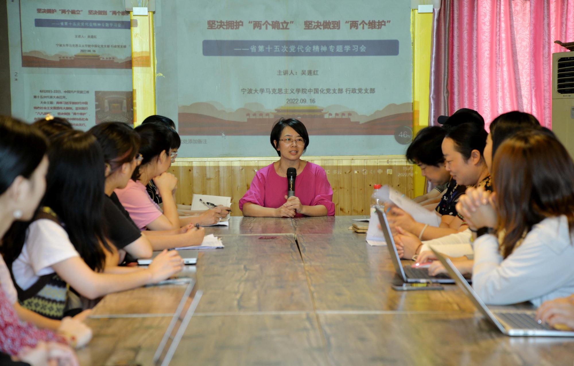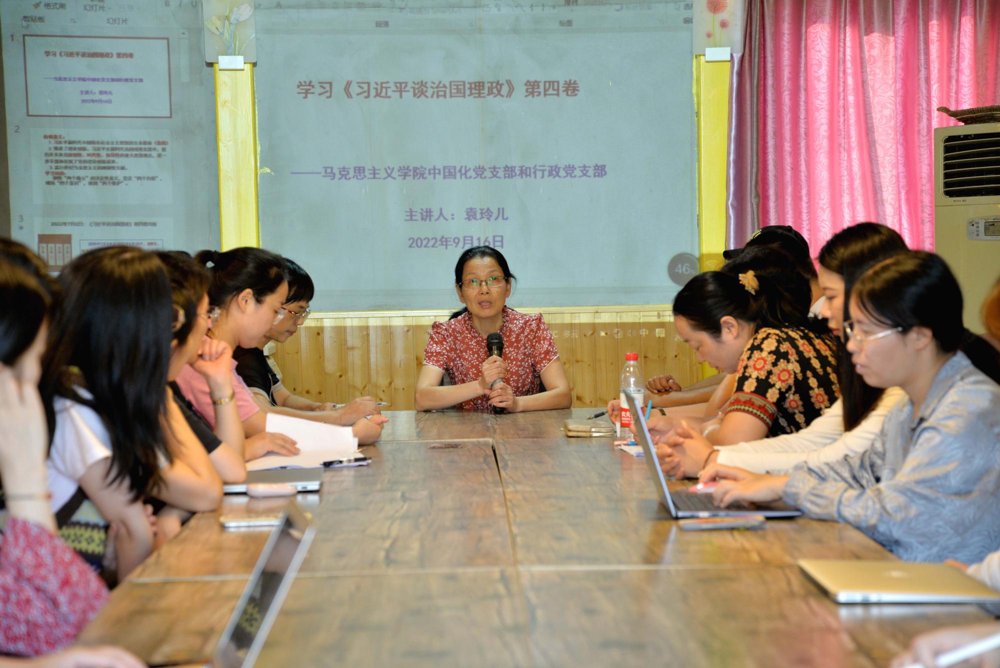9月16日晚,支部党员们在马克思主义中国化党支部书记袁玲儿的带领下,集体学习了《习近平谈治国理政》第四卷。袁玲儿指出,《习近平谈治国理政》第四卷是习近平新时代中国特色社会主义思想的文本载体;习近平在新时代治国理政实践中,提出许多具有原创性、时代性、指导性的重大思想观点,进一步丰富和发展了党的理论创新成果;是21世纪马克思主义的纲领性文献。袁玲儿强调,要深刻领悟“两个确立”的决定性意义,坚定“四个自信”,增强“四个意识”,做到“两个维护”。行政党支部书记吴莲红作省第十五次党代会精神领学,她以《坚决拥护“两个确立” 坚决做到“两个维护”》为题,从“8个方面规律性认识”“8个高地”“10个着力”等方面详细解读了省党代会报告要点和会议精神,指出要深刻领会“两个先行”的实践路径,增强贯彻落实省第十五次党代会精神的政治自觉、行动自觉。通过学习,进一步加深了党员们对习近平新时代中国特色社会主义思想的强大真理力量的深刻体悟,同时也更加明确对省党代会的核心要义的理解和今后努力奋斗的方向。