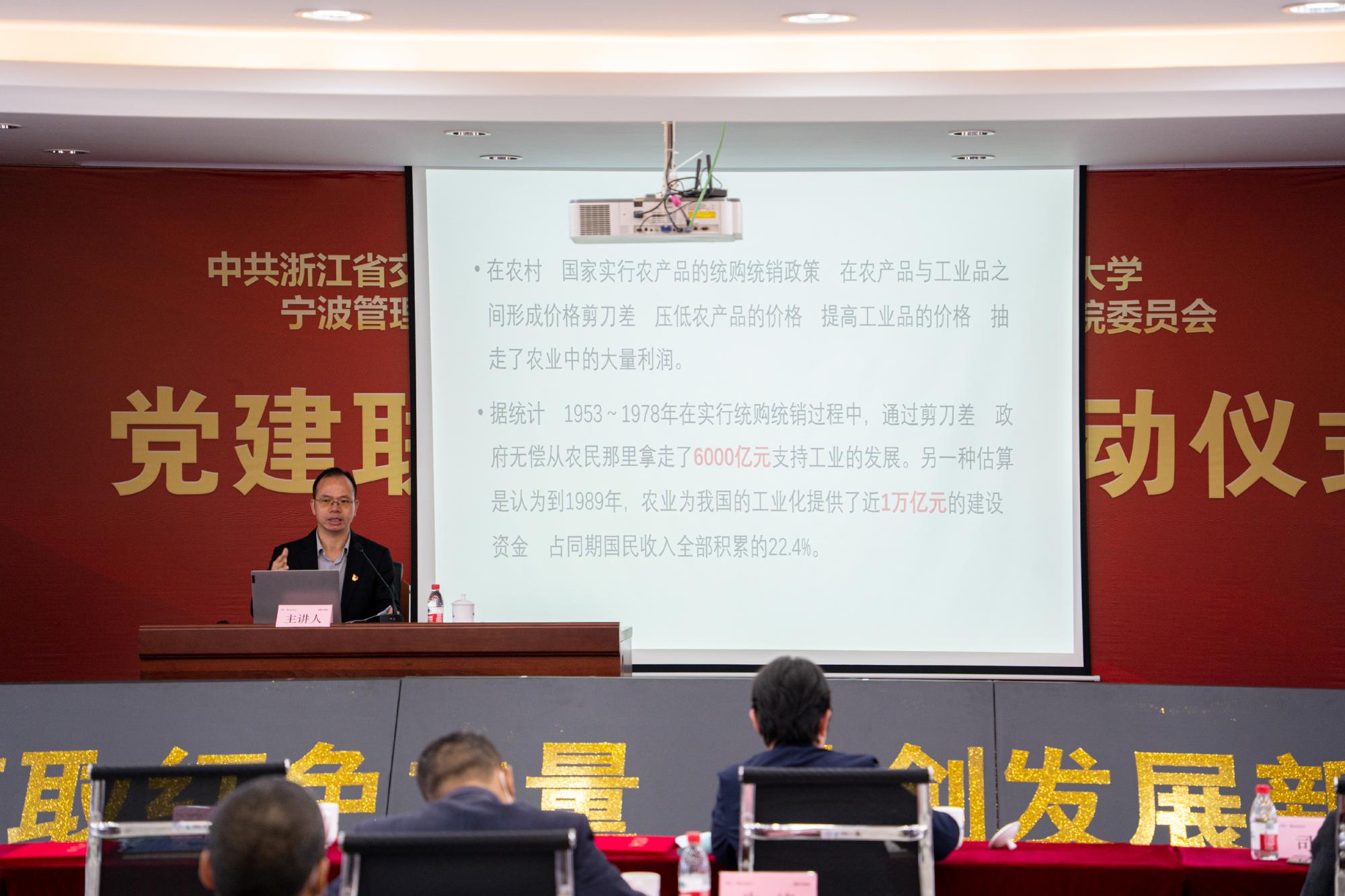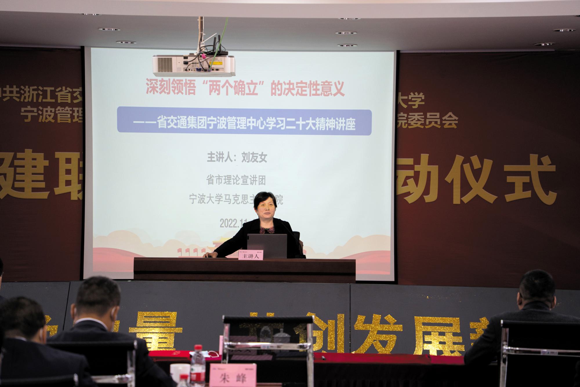 党建联建签约仪式后,刘友女以《深刻领悟“两个确立”的决定性意义》为题作党的二十大精神专题学习党课。讲座梳理党史脉络旁征博引,深情回顾了习总书记的成长历程,并结合浙江实践,详细解读了二十大的精髓要义、“两个确立”的核心要义。刘友女强调,在新的征程上,我们必须始终捍卫“两个确立”、做到“两个维护”,必须把“两个确立”真正转化为思想自觉、政治自觉、行动自觉,切实以“两个确立”统一思想和行动,在实现中华民族伟大复兴中国梦的伟大实践中贡献智慧和力量。宁大商学院副教授闭明雄受邀作《国有企业的现状与未来发展》报告。他围绕国有企业的来源及改革历程、国有企业的现状,结合二十大报告,条分楼析地阐述了国企改革的未来发展走向,并提出了自己的见解和看法。讲座内容丰富、深刻生动,既有理论高度、思想深度也有实践广度,与会人员收获满满,纷纷表示受益匪浅。