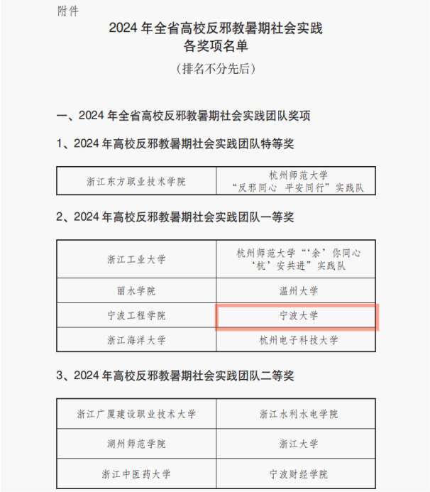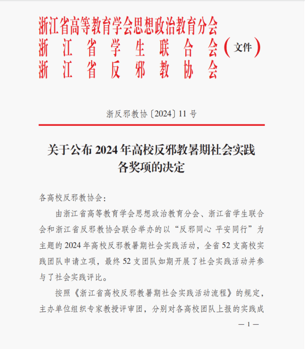 反邪教暑期社会实践的工作。截至目前,我校反邪教暑期社会实践团队在该项目上于2013年、2014年、2015年、2017年、2018年、2021年和2024年均斩获省一等奖。在祝贺我校获得该荣誉的同时,让我们提升防范邪教传播意识,携手共筑反邪防线。