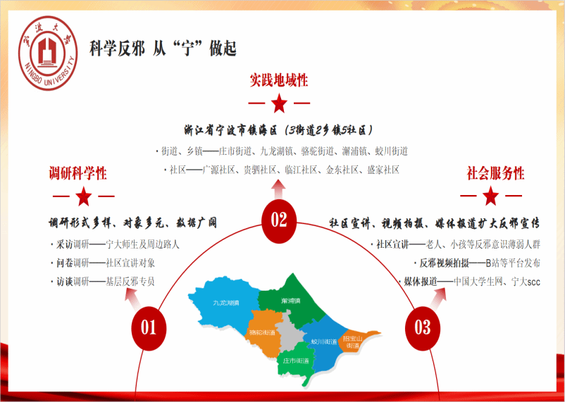 实践团队开展的基层访谈调研活动覆盖镇海区2乡镇3街道——庄市街道、骆驼街道、蛟川街道、九龙湖镇与澥浦镇,社区宣讲调研活动覆盖镇海区5社区——广源社区、贵驷社区、临江社区、金东社区与盛家社区,问卷采访调研活动涉及同城约炮