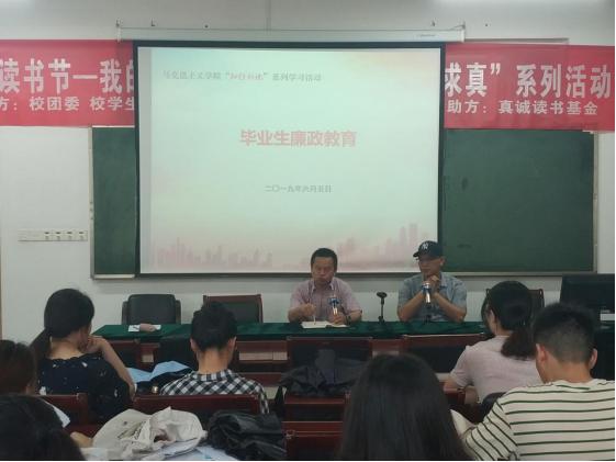 于2019年6月5日在11号楼102教室举办了”知行新说”系列学习活动暨毕业生廉政教育活动。
