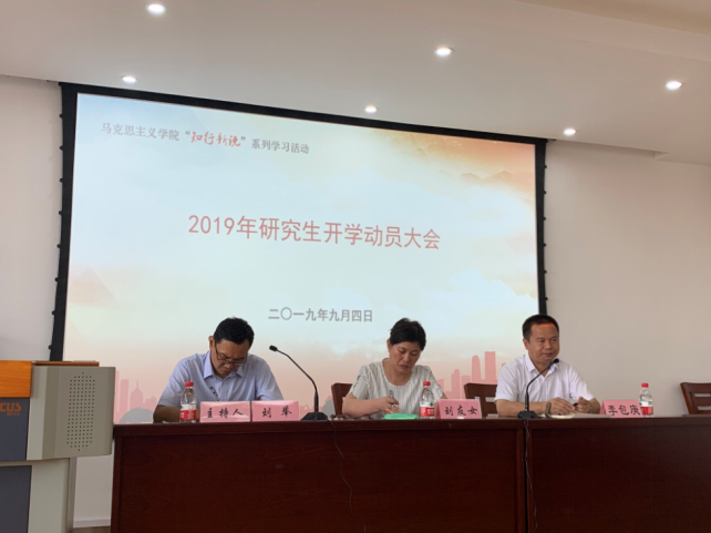 开展了2019年研究生动员大会,参会人员有党委书记刘友女、院长李包庚、副院长刘举、研究生部主任孟献丽、邹建峰老师、郑善庆老师、2018级研究生和2017级研究生。