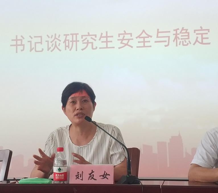刘友女书记从同学们的意识形态安全问题与学业问题两个方面出发,对同学们展开了教育。在意识形态安全问题上,刘书记教育同学们在面对网络舆情时,要有自己的理性思考,必须与中央声音保持高度一致,做到不信谣、不传谣。在学业问题上,刘书记指出同学们要及时与老师进行沟通交流,做好学生的本质工作,潜心做学问,禁止学习赚钱“两条腿走路”。