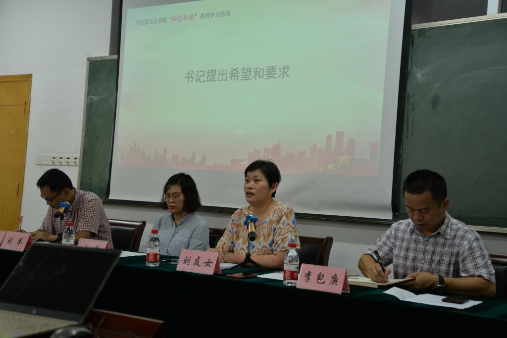 首先,主持人刘举老师向同学们依次介绍在场领导与老师,领导老师们对同学们来到马院进行专业学习表示热烈欢迎。其中,马院院长李包庚教授向同学们介绍:马院的发展近况与前景呈上升态势,并且以优秀学长学姐为例激励同学们向着目标前进;马院党总支书记刘友女与副院长曲蓉向同学们大致介绍了马院未来发展计划,给予同学们极大的信心;辅导员杨曼强调了寝室卫生以及学生请销假问题,表达了对同学们日常生活的关怀。