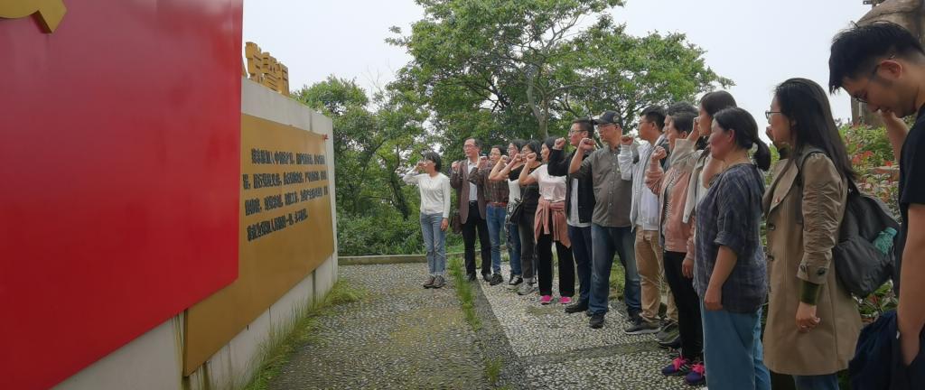 活动中,党员同志们在革命后代刘文跃的带领下,登上了大榭岛最高峰——七顶山,重温革命之路。解放大榭岛,是解放军渡海第一战。攻占七顶山也是解放大榭岛过程中最激烈的战斗之一,我军解放大榭岛牺牲的战士绝大部分都倒在这里,山上至今完整保留着七顶山主战场壕沟等战斗遗址。站在七顶山顶,面对党旗,全体党员同志再一次重温入党誓词,表示要传承红色基因,学习“渡海第一仗”舍身忘我的奉献精神、风雨同舟的团结精神,走好新时代的长征路。